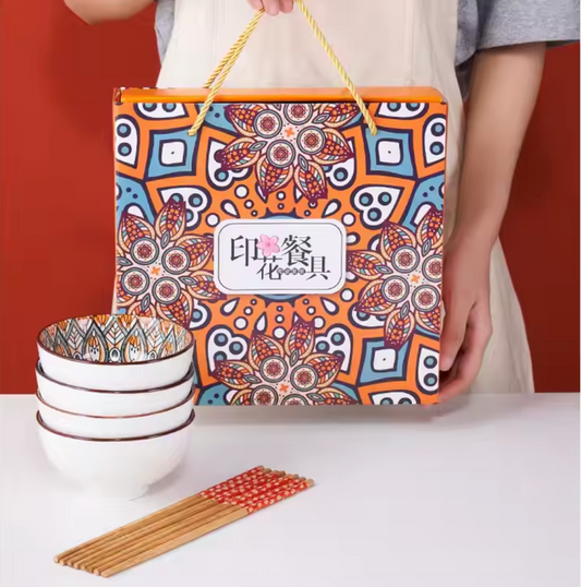 Set of 4 Bohemian Style Japanese Ceramic Bowl with Chopsticks